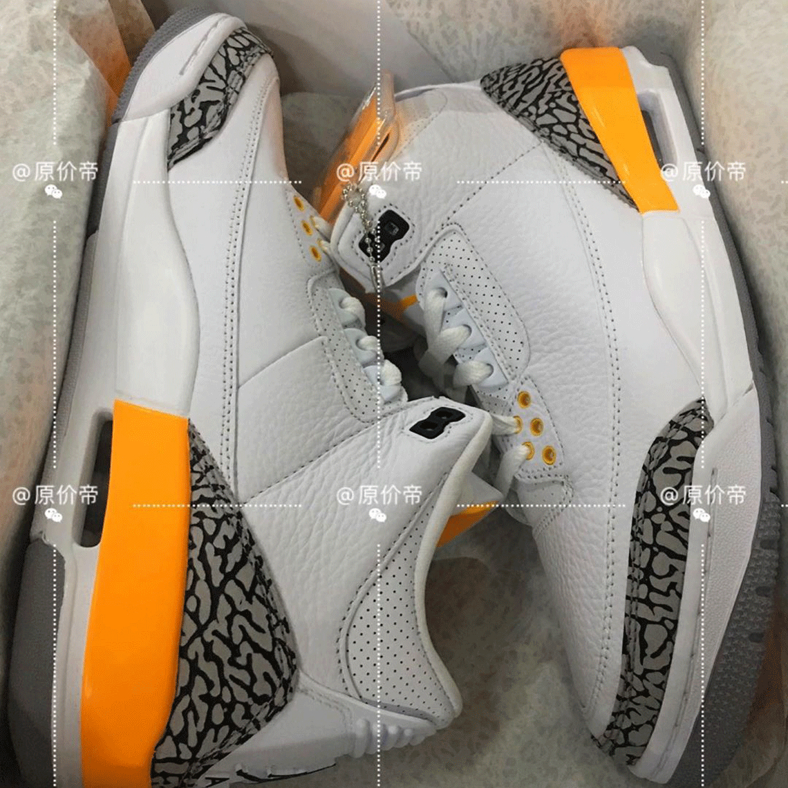 Clad in its unique “White/Cement Gray/Black” association, this Jordan three boasts “Laser Orange” accents throughout its higher and sole unit. The hue – which not too long ago appeared on an SB Dunk Low – takes over tooling on the heel, in addition to backside eyestays, Jumpman logos on and lining behind the tongue. The Jordan three’s signature hangtags additionally obtain the “Laser Orange” remedy.