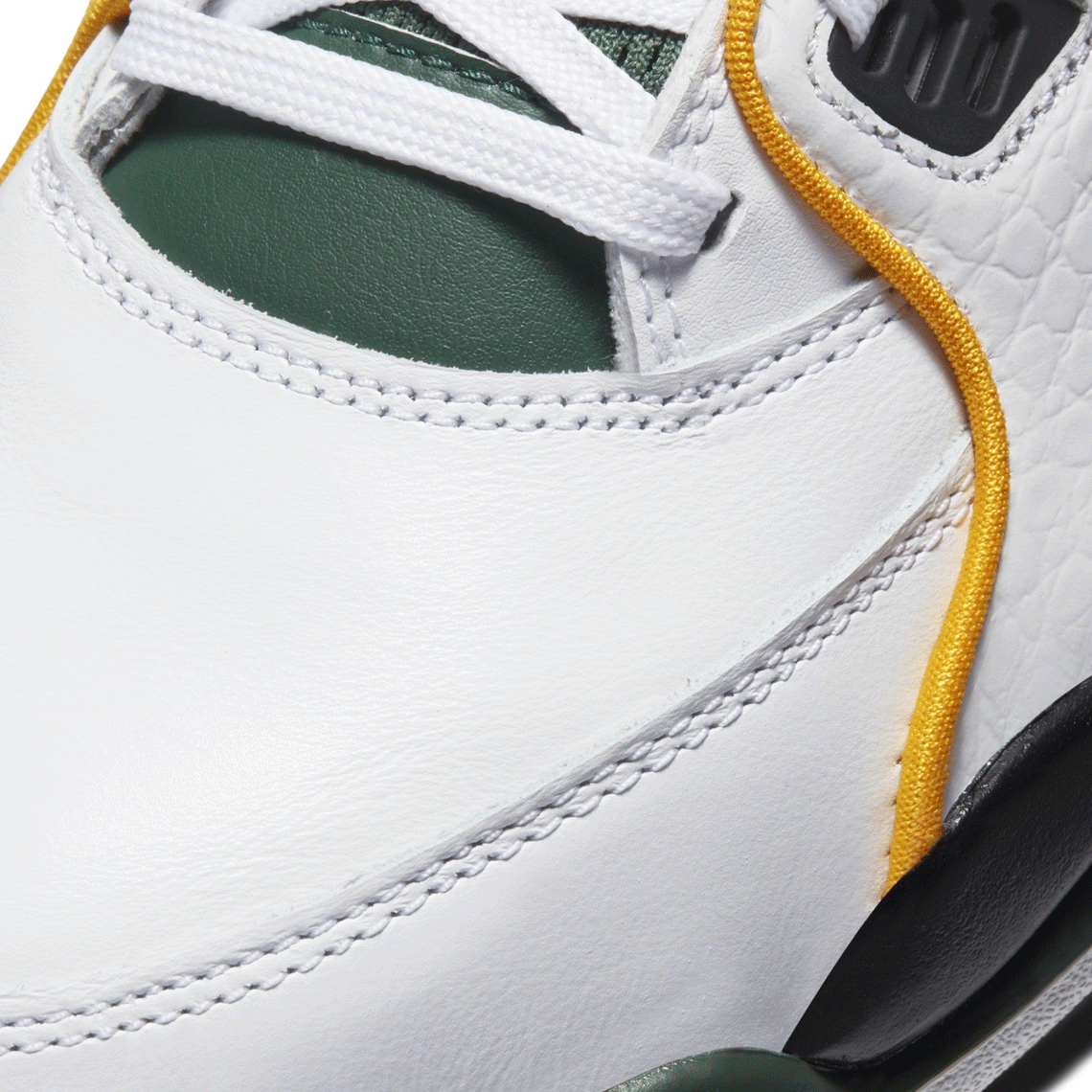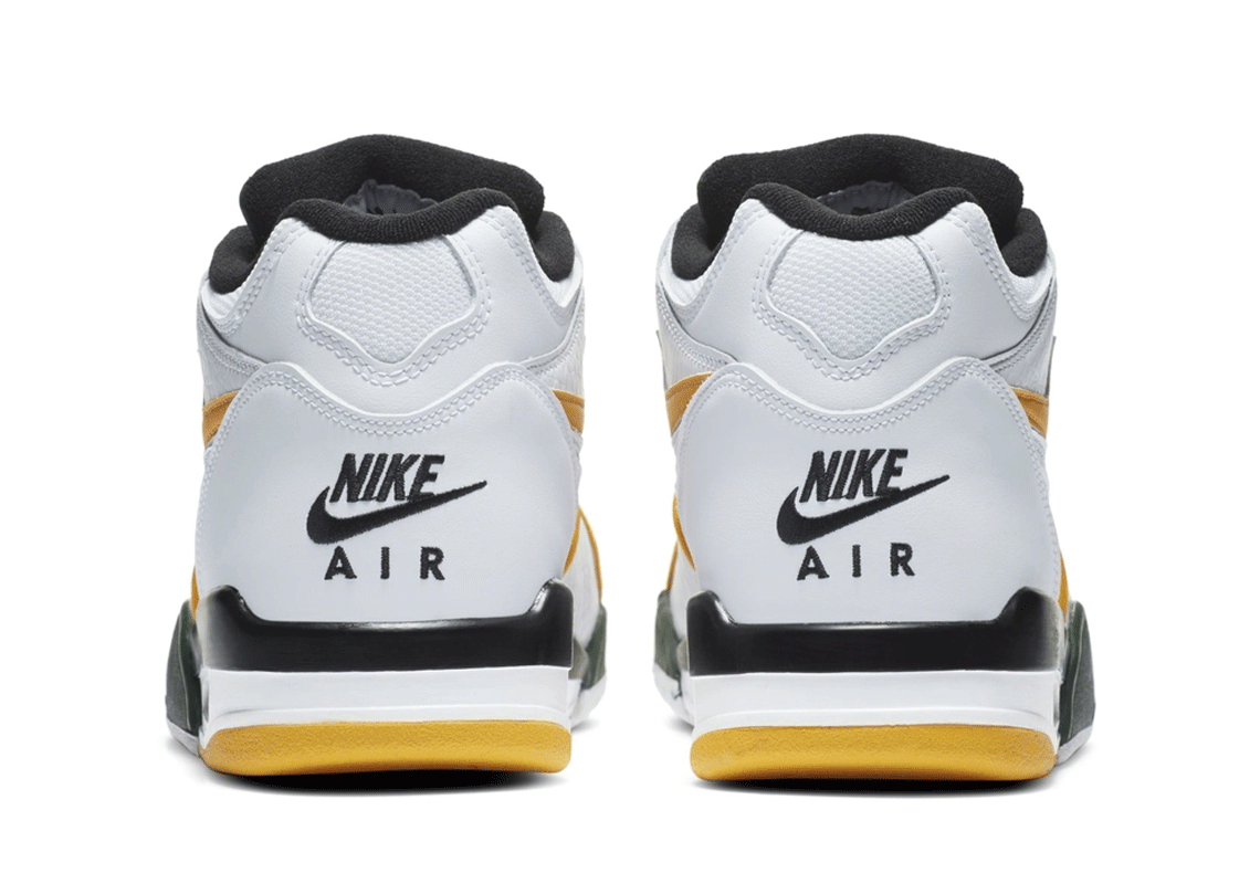 Constructed from a mixture of clean and tumbled leather-based, the Air Flight 89 indulges in a predominantly “White” association. Lining throughout overlays close to the forefoot, nevertheless, interrupt the tonal scheme with its yellow make-up. The wealthy hue additionally takes over profile Swooshes and “Flight” textual content on the tongue. Elsewhere, wealthy inexperienced enters the combo on the tongue and TPU eyestays. All three aforementioned hues coexist on the Air Jordan Four-like tooling underfoot, and accompanied by “Black” midsole accents, which additionally seems on “NIKE AIR” branding on the heel.